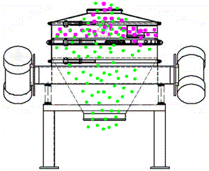 (2-2)直排篩工作原理:該系列篩機(jī)是利用兩側(cè)臥式振動電機(jī)為激振源,振動電機(jī)置于機(jī)體一側(cè),物料進(jìn)入設(shè)備內(nèi)部后,受振動源作用力在篩面上做橢圓運(yùn)動軌跡.快速并往復(fù)完成過網(wǎng)動作的同時,振動力能往并連續(xù)的對物料產(chǎn)生剝離、打散及重組的作用,從而使物料快速過網(wǎng),不能過網(wǎng)物料則按設(shè)備運(yùn)動軌跡由篩上排料口排出,完成篩分作業(yè)過程;