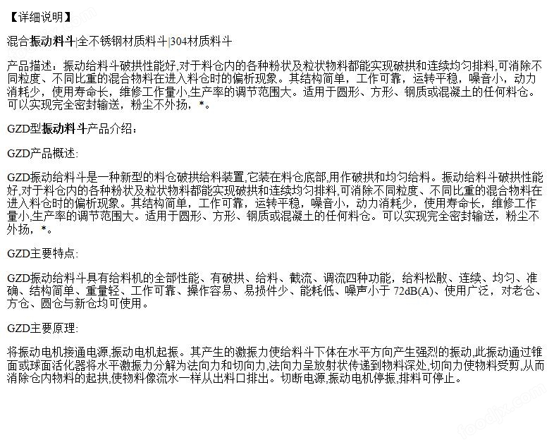 GZD振動給料斗是一種新型的料倉破拱給料裝置它裝在料倉底部用作破拱和均勻給料。振動給料斗破拱性能好對干料倉內(nèi)的各種粉狀及粒狀物料都能實現(xiàn)破拱和連續(xù)均勻排料可消除不同粒度、不同比重的混合物料在進(jìn)入料倉時的偏析現(xiàn)象。其結(jié)構(gòu)簡單,工作可靠,運轉(zhuǎn)平穩(wěn),噪音小,動力消耗少,使用壽命長,維修工作量小生產(chǎn)率的調(diào)節(jié)范圍大。適用于圓形、方形、鋼質(zhì)或混凝土的任何料倉??梢詫崿F(xiàn)*密封輸送,粉塵不外揚.