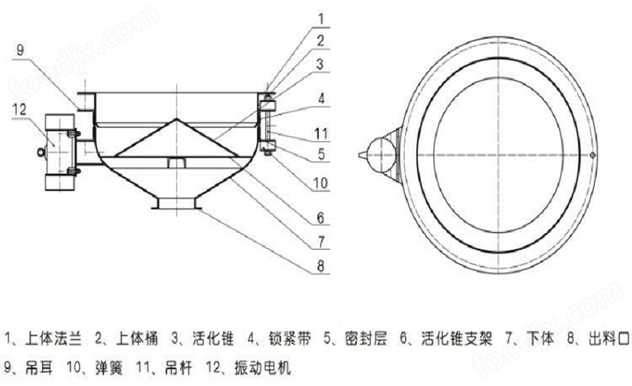 將振動由機接通由源攝動由機起振。且產(chǎn)生的激振力使給料斗下體在水平方向產(chǎn)生強列的振動此振動通過錐面或球面活化器將水平激振力分解為法向力和切向力法向力呈放射狀傳遞到物料深處切向力使物料受剪從而消除倉內(nèi)物料的起拱使物料像流水一樣從出料口排出。切斷電源振動電機停振排料可停止。