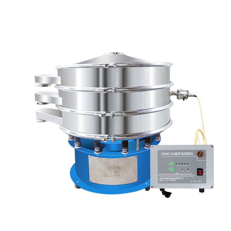 超聲波振動篩是在旋振篩的基礎(chǔ)上引入了超聲波清網(wǎng)裝置,通過將220V、50Hz或110V、60Hz電能轉(zhuǎn)化為18KHz的高頻電能,輸入超聲換能器,將其變成18KHz機(jī)械振動,從而達(dá)到高篩分和迅速清網(wǎng)的目的,使超微細(xì)粉篩分成為易事。該系統(tǒng)在傳統(tǒng)的振動篩基礎(chǔ)上在篩網(wǎng)上引入一個低振幅、高頻率的超聲振動波(機(jī)械波),以改善超微細(xì)粉體的篩分性能。特別適合高附加值精細(xì)粉體的用戶使用。超聲波篩分系統(tǒng)是一種簡單實(shí)用、可靠的篩分系統(tǒng),是當(dāng)前網(wǎng)孔堵塞的有效的解決方法。可廣泛應(yīng)用于制藥、冶金、化工、選礦、食品等要求精細(xì)篩分過濾的行業(yè),篩分過濾精度高,有效解決因團(tuán)聚、靜電、強(qiáng)吸附性卡堵網(wǎng)孔等篩分難題,是國內(nèi)篩分行業(yè)的一項(xiàng)重大技術(shù)突破。
