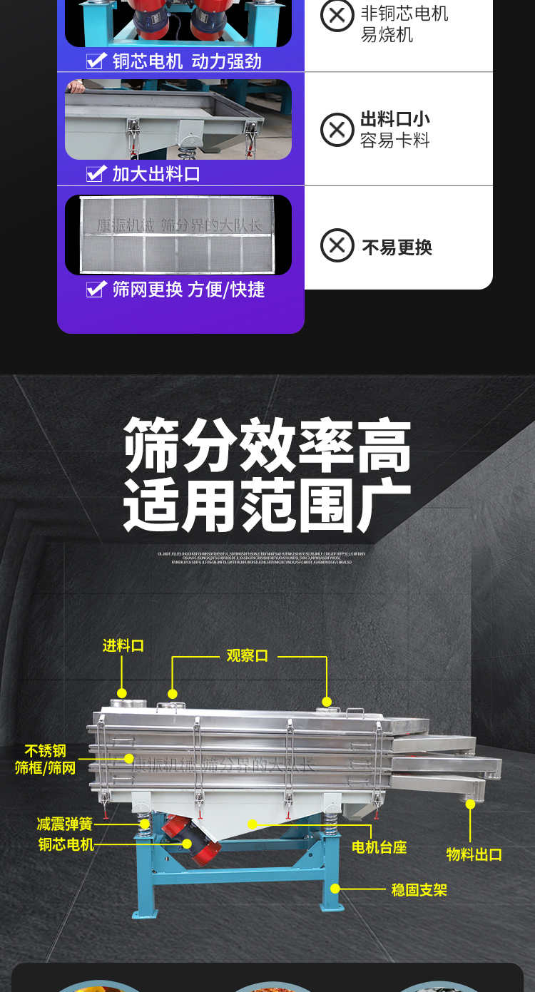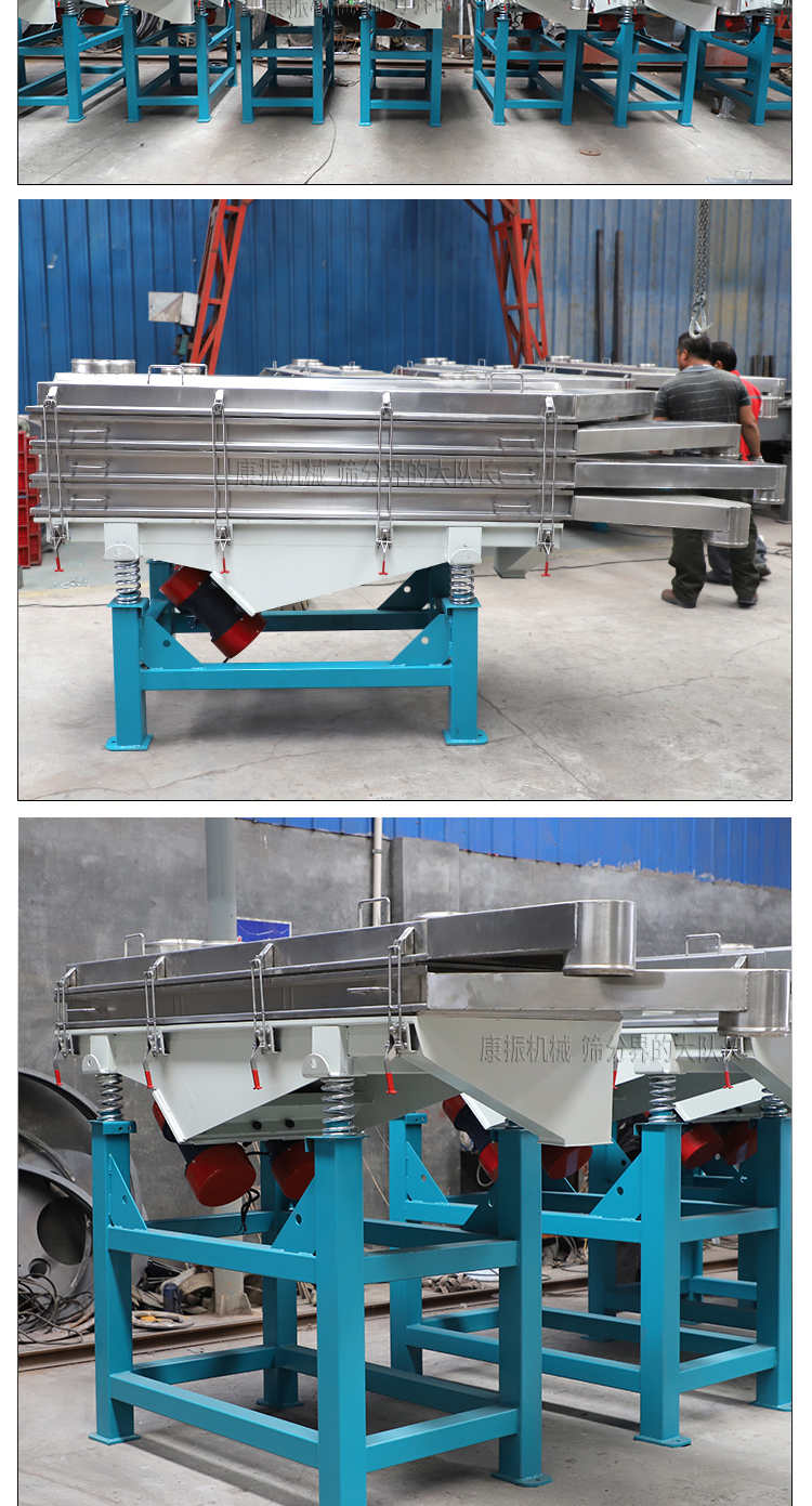是以利用振動電機激振作為振動源,使物料在篩網(wǎng)上被拋起,同時受力向前做直線規(guī)則運動,物料從給料機均勻地進入篩分機的進料口,通過多層篩網(wǎng)產(chǎn)生數(shù)種規(guī)格的篩上物、篩下物、從各自的出口排出。具有耗能低、產(chǎn)量高、結構簡單、易維修、全封閉結構,無粉塵溢散,自動排料, 更適合于高產(chǎn)能流水線作業(yè)。