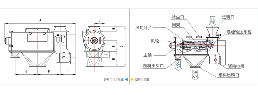 通過(guò)網(wǎng)筒內(nèi)風(fēng)輪葉片使物料同時(shí)受到離心力和旋風(fēng)推進(jìn)力,從而使物料噴射過(guò)網(wǎng),過(guò)網(wǎng)的物料從細(xì)料排出口排出,
